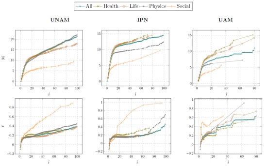 The second part of our analysis focuses on the following degree metrics: the complementary cumulative degree distribution , the average node degree , and the assortative coefficient r. Figure 5 shows the functions for the whole of the coauthorship networks, i.e., . These distribution functions indicate the proportion of authors that have collaborated with k or more authors. Similarly to the distribution of coauthor count per article (Figure 2), the log–log scale shows that the degree distributions may consists of two parts, each of them following the power law with different exponents. Because of this, the collaborative patterns of the analyzed universities obey the preferential attachment process, as it was expected. Let us now turn to and r; Figure 6 shows the evolution of these metrics across different collaboration orders i. As we can see, and r increase steadily and thus never converge. The value of increases as a consequence of the degree of new authors added in each . Regarding r, it gets the lowest values when , because the majority of authors (, see Figure 5) usually collaborate with authors whose degree ranges between 1 and 10. In contrast, r increases slowly when , owing to the remaining of authors having high degree and usually collaborating with authors that also have high degree, although some of these authors also keep low-order collaborations. This trend is more marked in social sciences, where r increases rapidly and reaches the highest assortativity in the universities analyzed. It suggests that in social science, high-degree authors only collaborate with high-degree authors.