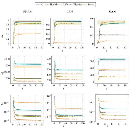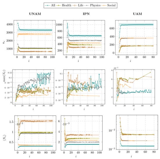 The next step of our analysis corresponds to the following network connectivity metrics: the relative size of the largest connected component , the number of connected components , and the proportion of isolated nodes . Figure 7 shows the evolution of these metrics across different collaboration orders i, while Table 2 presents the convergence values and indices for , , and . Let us consider the functions that converge in low collaboration orders . This is the case for the health, life, and physical sciences in UNAM; all subject areas in IPN; and physical sciences in UAM. In these cases, articles cowritten by 10 or more authors have at least a coauthor that also has collaborated with a low number of authors. Therefore, such an author adds their coauthors to the largest connected component when . Consider now the remaining cases: social sciences in UNAM and health, life, and social sciences in UAM, where the values of converge for high-order collaborations. In these cases, most authors with high-order collaborations have no experience in low-order collaborations; thus, authors with low-order collaboration are not added to the largest connected component. Note that in social sciences, there are the lowest values of among the analyzed universities. Regarding , Figure 7 shows that converges in low-order collaboration , which is consistent with the values of that are lower than . In contrast, converges in , and then the values of are higher than , which results from the low percentage of articles with 20 or more authors. In the social sciences, there is the highest proportion of isolated authors, i.e., , which is in IPN and in UNAM and UAM. In the rest of the subject areas, the proportion of isolated authors is around . It is important to mention that the proportion of isolated authors increases the value of the assortativity coefficient.