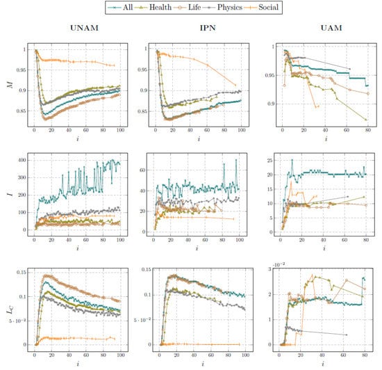 Finally, we analyze the community structure based on community quality metrics and community size metrics. Figure 8 shows the evolution of the following community quality metrics: the modularity M, the imbalance I, and the edge-cut size . Since in all subject areas and universities, the community partitions detected have high quality, making them a good representation of the emergent research teams. However, note that M drops steadily as i increases for all subjects areas in UAM and social sciences in both UNAM and IPN, which may be correlated with the evolution of . Let us remember from the previous subsection that in the mentioned areas, several authors only have high-order collaborations. In these cases, the community structure loses quality in high-order collaborations. In addition to M, Figure 8 shows that the values of I and are also low, which confirms the high quality of the community partitions. Note that among all subject areas, the social sciences have the highest community quality. Turning now to the metrics of community size, Figure 9 shows the evolution of the following functions: the number of communities , the relative size of the largest community , and the average relative community size . As we can see from Table 3, even though varies at each collaboration order, and are defined in low-order collaboration, i.e., . Therefore, the research teams (communities) emerge in low-order collaborations and remain in high-order collaborations.