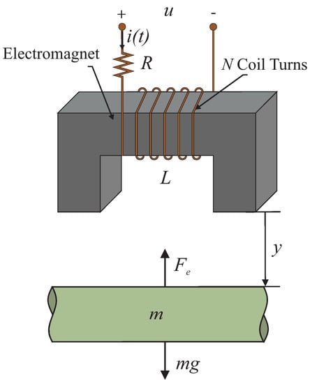 Without loss of generality to other schemes with multiple controlled electromagnetic actuators in which the property of differential flatness is presented, the electromagnetic suspension system considered in the present study is depicted in Figure 1. This nonlinear dynamic system is not stable in open loop. Effective and efficient control strategies should be then developed to guarantee disturbed nonlinear dynamic system stability. An electromagnetic force is generated by a properly controlled electromagnet in order to efficiently regulate the rotor vertical position y of a rotating mechanical system of mass m. In the control circuit, u denotes the voltage control input and i stands for the electric current signal. R represents the resistance, and denotes the inductance function of the coil depending on the rotor vertical position as follows []: