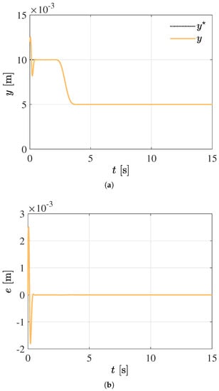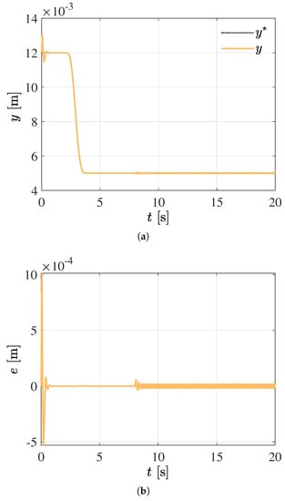 Figure 2 and Figure 3 depict the robust performance of the tracking control scheme based on sliding modes and differential flatness. The flat output is first regulated at the desired initial position m. As displayed in Figure 2, an efficient transference of the output variable y from the initial equilibrium position m towards the final equilibrium position m, following the reference trajectory into the time interval s, is then performed. The capability of the high-gain controller to effectively reject significant state-dependent disturbances is also corroborated in the tracking error response. The closed-loop responses of the control voltage and the electric current are displayed in Figure 3.