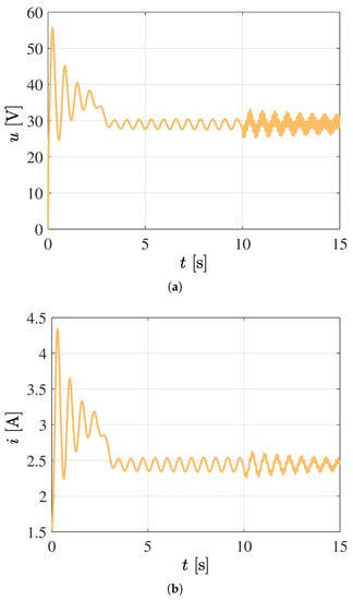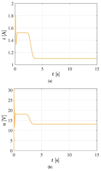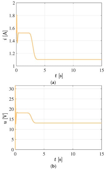 Satisfactory closed-loop system response considering an adaptive W and with a constant inductance . (a) Control voltage signal. (b) Electric current signal.