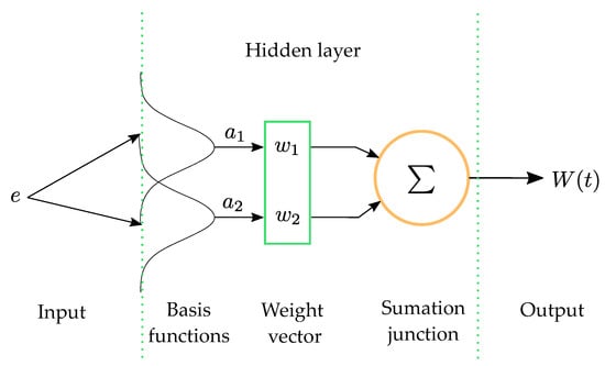 In this paper, from an adaptive-like control design approach, B-spline Artificial Neural Networks (BsNN) are integrated in the trajectory tracking controller based on sliding modes and differential flatness for the electromagnetic levitation system [,]. The inclusion of this adaptive strategy supports the robustness of the control law by the correct definition of a key parameter. The artificial neural network is precisely used for updating on-line the control parameter W based on tracking error information as portrayed in Figure 6. The structure of this class of neural networks consists of a hidden layer only. Here, activation functions permit to attain a nonlinear relationship of the output with respect to the input. Both input and output could be scalars or vectors. In this application, both input and output signals are scalars. This type of intelligent agent is effective for dealing with the system nonlinearities and uncertainties, since by using different learning rate indexes and inputs, the BsNN are capable to adjust iteratively in real time their synaptic weights by means of the constant learning process of the physical system []. The output is generated from a weighted linear combination of its basis function outputs, as observed in Figure 6.