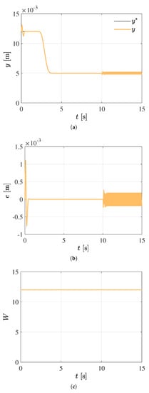 Closed-loop reference trajectory tracking for disturbed rotor vertical position using an adaptive W control parameter. ITAE = . (a) Position reference trajectory tracking. (b) Satisfactory trajectory tracking error. (c) Variable control parameter.