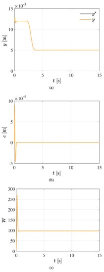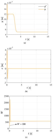 Satisfactory closed-loop system response considering an adaptive W and with a constant inductance . (a) Position reference trajectory tracking. (b) Trajectory tracking error. (c) Adaptive control parameter.