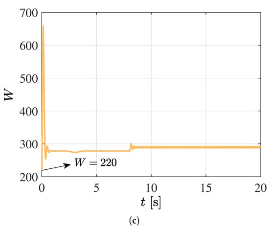 On the other hand, in Figure 13 and Figure 14 can be appreciated a deficient performance of the closed-loop system when using fixed value of the control parameter as . In fact, when considering a variation of the control gain as and a fixed value of , the system response is unstable. Moreover, as indicated in the figures, for the purposes of highlighting the improved system performance using the neural neural network tracking control, the initial value of the W parameter matches the fixed cases, where for both case studies, it can be seen the system is able to recovering from an initial faulty operational condition when the W control parameter is on-line computing by the B-spline neural network-based adaptive framework.