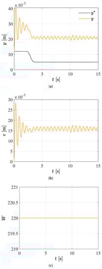 Furthermore, instead of the position dependent-variable inductance given by Equation (1), the performance of the tracking control scheme is verified when it uses a constant approximate value for the inductance as: . Figure 4 and Figure 5 describe the satisfactory results obtained for this second situation. As displayed in Figure 4, an acceptable reference position trajectory tracking can be similarly achieved. In Figure 4, the acceptable tracking error response is verified as well. In Figure 5, the electric current and voltage responses are depicted. Nevertheless, in this second case study, the control parameter W should be incremented from 300 to 350 to suppress parametric uncertainty disturbances.