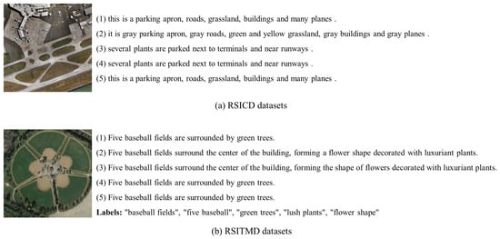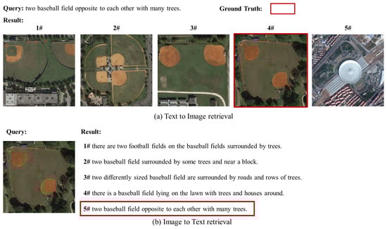In recent years, remote sensing (RS) technology, which plays an important role in the satellite and unmanned surveillance aircraft industry, is developing rapidly. Under this trend, RS images have shown explosive growth [,], which bring challenges to multiple tasks, such as large-scale RS image recognition, detection, classification, and retrieval. Among these, remote sensing cross-modal text-image retrieval (RSCTIR) [,,,,] aims to find the same or similar images in a large-scale RS image dataset according to the given natural language descriptions, and vice versa, as Figure 1. RSCTIR enables ordinary users, not limited to professionals or researchers, to achieve retrieval tasks only by natural language or visual input. It presents a better application value of human–computer interaction and information filtering, which leads to a wide range of application prospects in military intelligence generation, natural disaster monitoring, agricultural production, search and rescue activities, urban planning, and other scenarios [,].