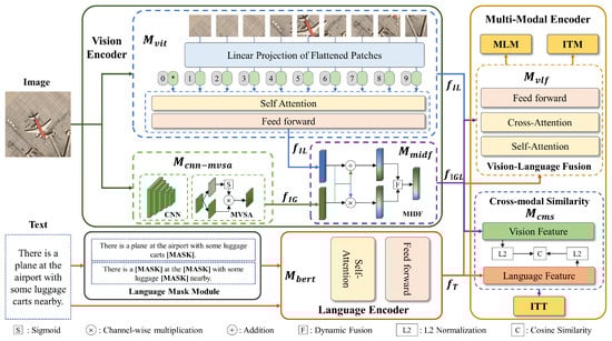 We thus focus on the embedding based methods, which mainly generate visual and text features from two uni-modal encoders, respectively, and optimize the encoders by minimizing vector distances with similar semantics in a high-dimensional space. In view of the high intra-class similarity and large inter-class differences of RS images, the current RSCTIR framework is mainly based on convolutional encoders to extract the global features of images [,] and object-detector-based encoders for the local information []. Finally, the two uni-modal features will be compared for loss optimization. In other words, the core of the whole framework is to build a language or visual uni-modal encoder with better feature expression ability. Although these methods have achieved good retrieval performance, they do not integrate the features of text and image in the training process by vision-language fusion. Secondly, most of them use pre-trained object detectors for image local feature extraction. Although it can effectively improve the ability of the model to express the detailed features of RS images, the training processes for the object detectors and the cross-modal retrieval model are fragmented.