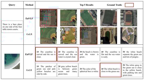 Visual comparison of retrieval results between EnVLF and the state-of-the-art GaLR on the RSITMD test set for two retrieval tasks. Among the top-5 candidates, the red box surrounds the ground truth.