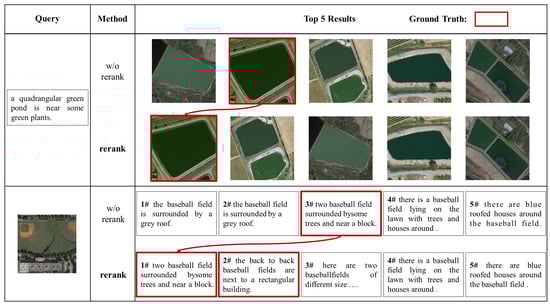 Visual comparison of the rerank module for two retrieval tasks on the RSITMD test set. Among the top-5 candidates, the red box surrounds the ground truth.