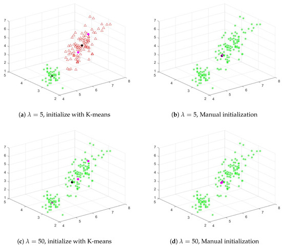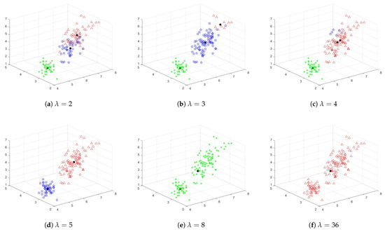 After initializing the KLFCM clustering algorithm with manually given cluster centers, we choose different values to observe their influence on the clustering result. The clustering results corresponding to different values are listed in Figure 3b–f.