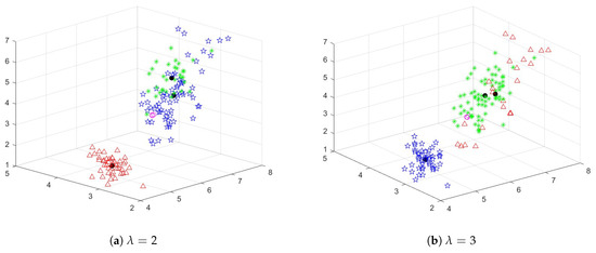 For a better understanding of the impact of the fuzzy parameter on the output results of the KLFCM algorithm, we conducted experiments using the Iris dataset as the experimental object to observe the clustering results obtained by selecting different fuzzy parameters. In the clustering results, we used * (green asterisks), Δ (red triangles), and ⋆ (blue pentagrams) to represent sample points that belong to different clusters. The sample cluster centers were represented by black circles ●. In the use of the KLFCM clustering algorithm, it is generally necessary to initialize the cluster centers and membership matrix of the algorithm. To accomplish this task, we utilize the K-means clustering algorithm for initialization. Specifically, we use the K-means clustering algorithm to divide the sample data into k clusters and use each cluster’s centroid as the initial cluster center in the KLFCM algorithm. Additionally, based on the K-means clustering results, we calculate the distance between each sample point and the various cluster centers, which allows us to establish the initial membership matrix in the KLFCM algorithm.