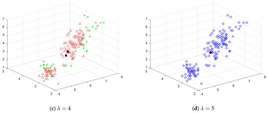 To illustrate the clustering outcome, we use different colors and shapes to signify data points that belong to different clusters. Furthermore, we represent the initial cluster centers with ○ (magenta circles). It can be seen from Figure 3 that, although the three clustering centers are very close during initialization, as long as we choose appropriate fuzzy parameters, the KLFCM algorithm can still produce relatively good clustering results through iteration. This is demonstrated in Figure 3b–d. We observed that as the value of the fuzzy parameter increases, the KLFCM algorithm may produce clustering results where all samples belong to the same cluster. For example, when lambda = 3.7. We further calculated that when lambda = 3.7, the spectral radius of the Jacobian matrix at coincident clustering result is equal to 1, . In other words, since the KLFCM algorithm inherently exhibits self-annealing properties, choosing appropriate parameters that satisfy will ensure that the algorithm produces interpretable and acceptable clustering results with any initial cluster centers, except for the case where all initial cluster centers are set equal to the sample mean. This finding is particularly intriguing. Next, we present more experimental results on real datasets.