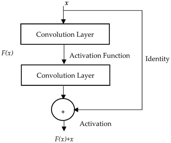 ResNet is a widely used efficient residual learning-based deep CNN model []. It allows a network to learn the identity mapping of residual blocks instead of the underlying mapping. The residual block is shown in Figure 1; it consists of a residual function F(x), an identity mapping, and the desired underlying mapping H(x), which is expressed as H(x) = F(x) + x. The residual function F(x) is modeled with two convolutional layers. One activation function is added after the first convolutional layer and another after the summation of the outputs of the second convolutional layer and the identity layer. This block prevents the vanishing gradient problem by shortening the path between the input and output of the neural network.