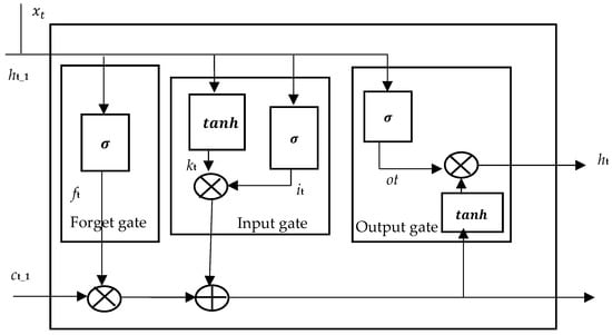 where and are the output values of the input gate, and are the weight matrix and bias in the of the input gate, respectively, and are the weight matrix and bias vector in the input gate tanh function, respectively. The equations for the output gate, as shown in Figure 2, are: