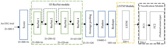 As mentioned, the CNN is one of the most successful deep learning-based models for analyzing EEG trials. However, a sequential CNN model suffers from overfitting and vanishing gradient problems because it involves a huge number of learnable parameters and uses conventional learning. Based on the residual learning theory and LSTM, we propose a deep network with fewer parameters to overcome these problems. The network consists of three main modules: 1D ResNet, LSTM, and the classification module, as shown in Figure 3. A description of the architecture of each module is presented in the following paragraphs.