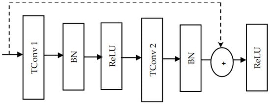The architecture of the ResNet module, as shown in Figure 3, consists of four 1D residual blocks. Each ResNet block has two temporal convolution (Tconv) layers, as shown in Figure 4. The temporal convolution layers allow the network to learn and capture temporal features. Each temporal convolution layer is followed by a batch normalization layer that helps to improve the stability and speed of the training process by normalizing the activation. Two rectified linear unit (ReLU) activation functions are included in the ResNet module. The first ReLU is added after the first batch normalization layer, whereas the second ReLU is added after the summation step. The purpose of adding ReLU layers is to address the vanishing gradient problem. This in turn helps to reduce the computational complexity of the network.