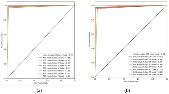 For the training ROC curve shown in Figure 5a, the model recorded an average ROC true positive rate of 0.99. Moreover, a perfect performance was revealed for all classes, as illustrated in the upper left corner of the graph. A true positive rate of 1 is recorded for classes MY and AB, indicating a perfectly accurate classification. A true positive rate of 0.99 is recorded for classes TC, SP, and TN, with a false positive rate of 0.01. Additionally, the recorded true positive rate for classes GN, FN, and CP is 0.98, with a false positive rate of 0.02. Hence, the model revealed a negligible false positive rate for classes TC, SP, TN, GN, FN, and CP and a zero false positive rate for classes MY and AB. Therefore, the model is promising in distinguishing between positive and negative samples. In contrast, the test ROC curve revealed a positive rate of 0.99 for class MY and 0.95 for classes GN, FN, and CP, while the false positive rate is between 0 and 0.03 for those classes at that point. Hence, the proposed model achieved a promising performance in distinguishing between positive and negative samples with an average ROC true positive rate of 98%.