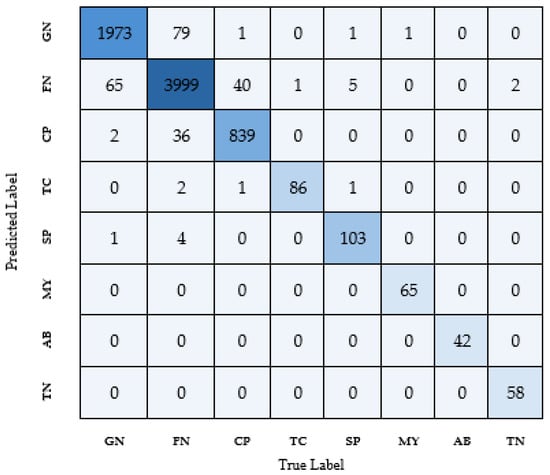 Moreover, it can also be noticed that there are also misclassifications between the CP and FN classes. These misclassifications between these three classes are mainly due to the overlapping or similarity of their characteristics. It means that there are similar patterns or features between these classes that are difficult for the model to differentiate. On the other hand, the other classes, TC, SP, MY, AB, and TN, are mostly correctly classified with few or no misclassified data.