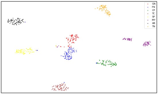 The t-distributed stochastic neighbor embedding (t-SNE) is a non-linear, powerful, statistical visualization technique that assists in visualizing high-dimensional data and finding patterns by projecting them in lower dimensions. Thus, a 2D t-SNE model was applied in this work to visualize the distribution of classified data over the eight classes, as shown in Figure 7. It can be noticed that the samples of eight classes are well separated and clearly clustered, as we can see in the plot. There is a clear separation between classes, especially AB and TC. However, there are some outliers from classes FN and GN moving to other classes, as described in the confusion matrix. In addition, FN and GN seizure classes are close to each other. It indicates an overlap in their respective features.