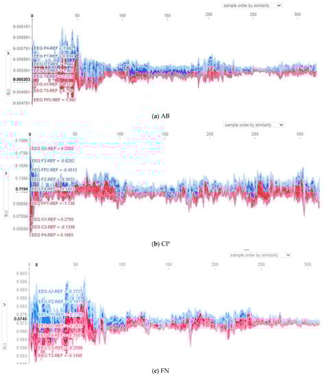 For class AB, as shown in Figure 8a, contributions spread over almost all channels with varying contribution values. This is also clear in the topo map of class AB, shown in Figure 9a, represented in dark colors. It is obvious that channels O1, T6, F7, and T5, represented in Figure 8a and in the darkest color in Figure 9a, have a positive impact on the model output and recorded magnitude of contribution in the range of 0.004 to 0.006 to the predicted label. For class CP shown in Figure 8b, channels O1, C3, FP1, and F4 positively impact the model output, which is also proved in the topo map of class CP shown in Figure 9b. The revealed contribution magnitude for those channels ranges from −0.13 to 0.17. For class FN, as illustrated in Figure 8c, channels O2, C3, and T3 positively impact the model output and reveal contribution magnitude in the range from −0.2 to 0.3. Those channels are also revealed in a darker color in the topo map of class FN shown in Figure 9c. It is obvious from the force plot of class GN shown in Figure 8d and the topo map shown in Figure 9d that contributions concentrate in two channels only, FZ and FP1, where those channels have a positive impact on the model output and reveal contribution magnitude in the range from 0.04 to 0.06.