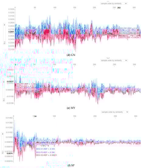 SHAP force plots are used to visualize the SHAP values and show how features explain the model output and which features had the most impact on the model output for a single observation. In this paper, multi-output force plots are presented for all data points. Force plots are flipped to be vertical and then stacked against each other for the eight classes, as shown in Figure 8, to illustrate how channels positively or negatively affect the model output. In all presented multi-output force plots, red bars illustrate channels that increase the predicted value above the baseline, whereas blue bars represent channels that decrease the predicted value. Moreover, the X-axis represents the input instances sorted by similarity, while the Y-axis shows the output prediction values of the model before being converted into probabilities.