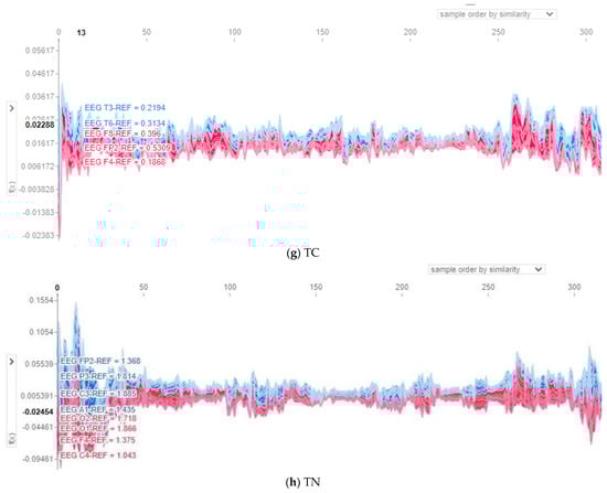 The contribution in the MY class concentrates on channel T4 only with −0.47 magnitude, as shown in the force plot in Figure 8e and the topo map in Figure 9e. The PZ channel is the most effective for the SP class, as shown in Figure 8f, with a −0.08 contribution magnitude. This is also clear in the topo map of the class shown in Figure 9f. The force plot of class TC shown in Figure 8g revealed that channels T3, T6, and FP2 have a positive impact on the model output and reveal contribution magnitude in the range from 0.2 to 0.5. This is also clearly indicated in the topo map shown in Figure 9g. Finally, the most effective channels for class TN, as shown in Figure 8h and Figure 9h, are O2, C3, FP2, F4, and C4, with contribution magnitudes in the range from 1.05 to 1.7. Hence, it is obvious from these results that all channels in EEG trials have good contributions in each seizure class. These findings are in accordance with clinical findings []. Moreover, EEG trials are able to classify different types of seizures.