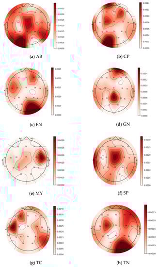 Contributions of the 21 EEG channels from the generated topo maps for the eight classes: (a) AB, (b) CP, (c) FN, (d) GN, (e) MY, (f) SP, (g) TC, and (h) TN classes.