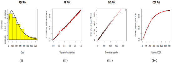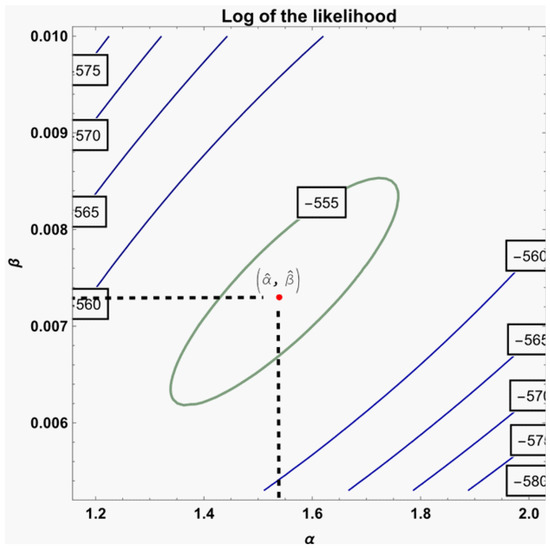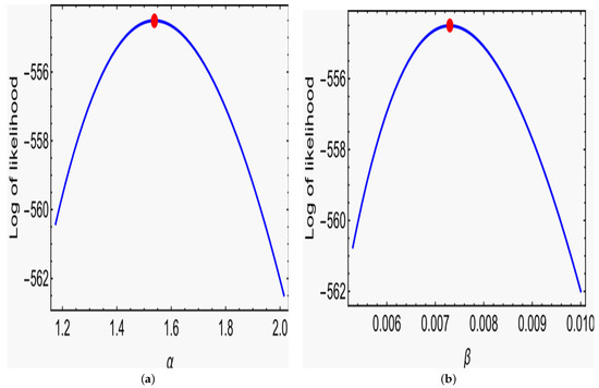where is the digamma function and is Meijer’s G-function. For the definition and properties of Meijer’s G-function, we refer to Mathai [23] and Askey [24]. Clearly, the roots of the nonlinear (10) and (11) cannot yield solutions to and in a closed form, so some numerical techniques, such as the Newton–Raphson (NR) method, are employed to derive the MLEs ( and ). The MLEs of the and are obtained using the invariance property of MLEs, such as