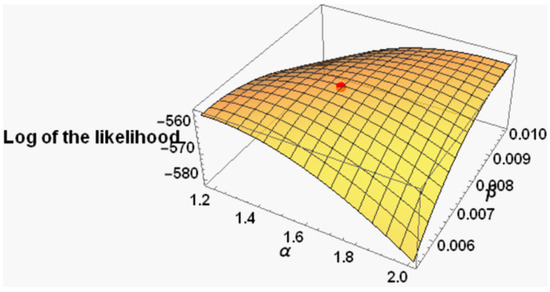 Before creating PFF censored samples, we would like to provide an initial idea of the different estimators based on the complete data (, ). First, based on the complete data, the MLEs of the , , , and are calculated and provided in Table 1. When dealing with full data, the MLEs were calculated using both the NR and EM algorithms, and we discovered that the values are identical. Thus, the results are only provided once in Table 1 to avoid repetition. Similar reasoning can be applied to the MLEs’ approximated 95% CIs. Figure 2 gives a likelihood function surface plot for a two-parameter gamma distribution. Figure 3 gives the contour plot of the profile log-likelihood parameters and . It reveals that the maximum value is attained at (. Furthermore, we depict the graphs of parameter profile versus log-likelihood function in Figure 4. From these graphs, we can say that the estimated ML can be calculated uniquely, or equivalently, the log-likelihood for this data is maximized when and .