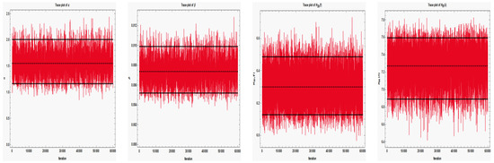 For Bayesian estimation, given by Section 4, we cannot obtain the informative priors, so all Bayesian estimates are obtained here based on the noninformative prior (NIP) (). Using the MH algorithm described in Section 4.3, we generate MCMC samples and discard the first samples as burn-in. To run the MCMC algorithm, the ML estimates of , and are taken to be the initial guesses. Under SE and LINEX loss functions (with ), the Bayesian MCMC estimates and associated 95% credible intervals of , , , and using both of the noninformative priors are computed and presented in Table 1. From Table 1, we can see both the MLE and the Bayes estimates of , , , and are relatively close. We considered a convergence diagnostic criterion proposed by Geweke [37] to confirm the convergences of chains generated via MCMC, assuming a 95% confidence level. This graph allows us to confirm the convergence of the chain. Trace plots based on 60,000 chain values of , , , and are provided in Figure 5 to demonstrate how well the simulated MCMC samples approximate. Each trace plot displays the sample’s arithmetic mean (represented by a dashed horizontal line) and its 95% HPD intervals (represented by a solid horizontal line). It shows that the MCMC method based on the remaining 60,000 variates converges successfully, and that using the first 10,000 samples as burn-in is suitable from a size point of view to eliminate the influence of the initial values. The histograms for the parameter estimates based on 60,000 chain values and the Gaussian kernel are also shown in Figure 6. The estimates unequivocally demonstrate that each and every one of the generated posteriors is symmetric with respect to the theoretical posterior density functions. The estimates clearly indicate that all of the generated posteriors are symmetric with respect to the theoretical posterior density functions.