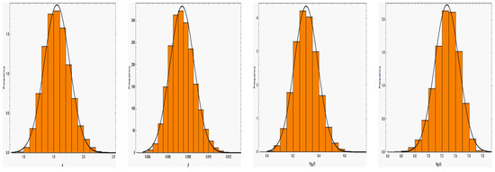 MCMC methods provide a general solution for obtaining approximate samples from any target density. They are ubiquitous in modern statistics, especially in Bayesian fields. In Bayesian analysis, the main object of interest is the posterior distribution, which most often does not have a closed form, such as our situation. The Gibbs sampling algorithm (Geman and Geman [34]) and Metropolis–Hastings (M-H) (Hastings [35]) are among the MCMC algorithms commonly used in Bayesian estimation, and each of them needs the marginal posterior distributions to be used in the sampling method. After analyzing the posterior distribution given by (47), the full conditional posterior distributions for and based on the informative gamma priors are obtained, as follows: