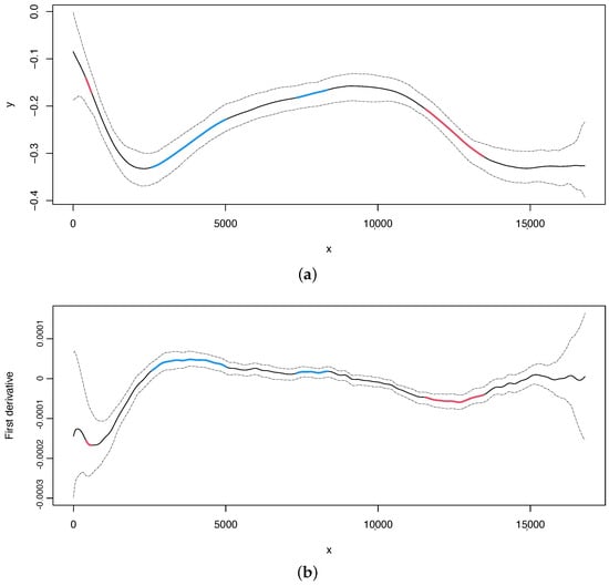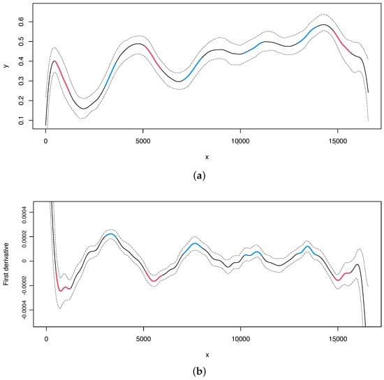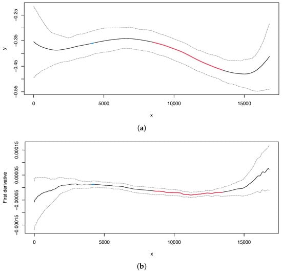 In the case of skew, we can obtain the estimated curve and its first derivative with 95% bootstrap confidence intervals in the same way as for the skew (Figure 4, upper and lower panel, respectively). Our method can detect two change points at positions 4264 and 11,186, which overlap with the change points located in the skew, as also reported in [13].