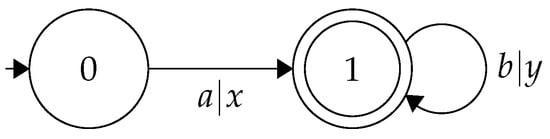 We consider the plant T in Figure 1, where , , , , and . We have . FST T replaces the input symbol a with x and b with y, for instance . The transducer performs the following mapping: