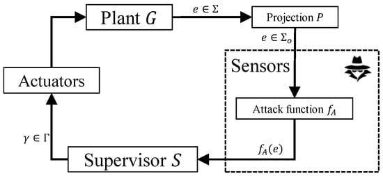 A cyber-physical system typically consists of a physical process with sensors that report the process’s status to a controller, which then sends commands or control signals to actuators to keep the system in its desired states. Cyber-physical systems are an assemblage of contemporary computer-integrated systems, including the infrastructures of human-being society []. Recent years have witnessed a suite of studies that tackle cyber-security issues in discrete-event systems [,,,,,]. Much attention has focused on the attacks on sensors and actuators at the supervisory layer of cyber-physical control systems. In a networked environment, it is assumed that sensors and actuators can be compromised by an external attacker (typically assumed to be malicious) who may alter the sensor readings provided to a supervisor or the control actions sent to actuators. A thorough overview on cyber attacks and defences for the supervisory control of cyber-physical systems is found in Refs. [,,,,,].