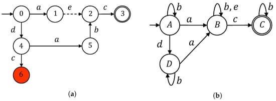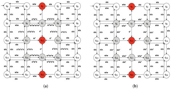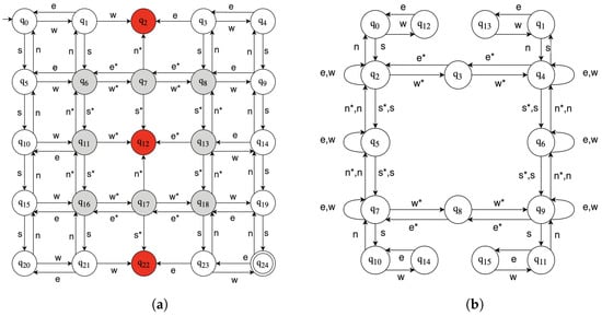 In this section, we provide an overview of a transition system represented as a finite-state automaton (FSA), specifically a deterministic finite-state automaton (DFA). A DFA is defined as a five-tuple , where Q is a finite set of states, is the set of events or alphabet, is the deterministic transition function, is the initial state, and is the set of final or marked states. We denote by a defined transition in G, indicating that event is active (or feasible) at state . Transition function can be naturally extended to by defining and for , , , and is the empty string. Similarly, the transition function can be also extended to .