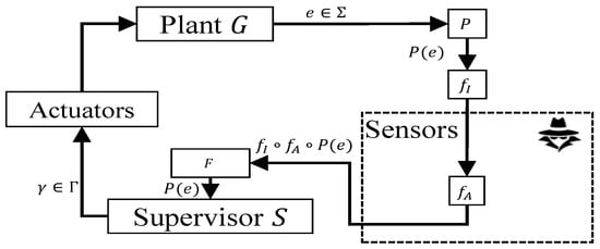 As outlined in the supervisory control theory, originated from Ramadge and Wonham’s research in discrete-event systems [], we examine a networked supervisory control system as depicted in Figure 2. It is assumed that the system, referred to as “plant” G, has a collection of sensors that may be susceptible to vulnerabilities. The behaviour of G is controlled by a “supervisor” S that enforces a safety property on G.