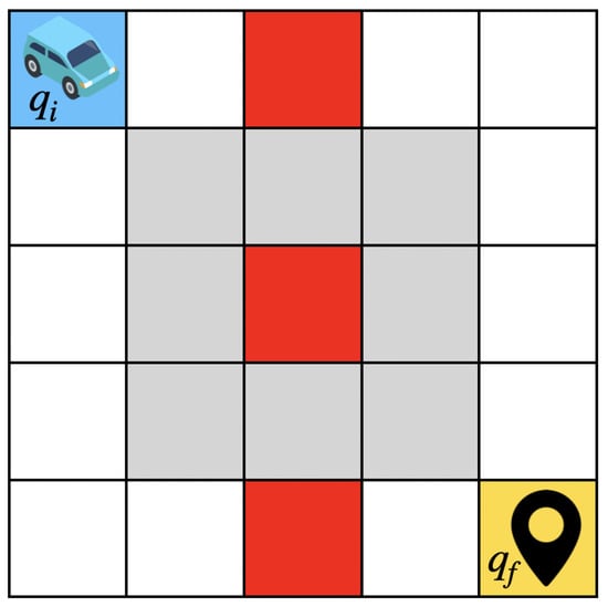 Vehicle grid: The vehicle starts in the blue cell denoted by , the shaded area is considered hostile, and the sensor readings in this area are compromised.