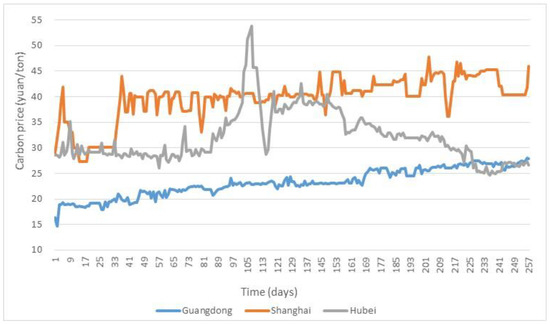 The original transaction prices of the carbon trading market in Guangdong, Shanghai, and Hubei.