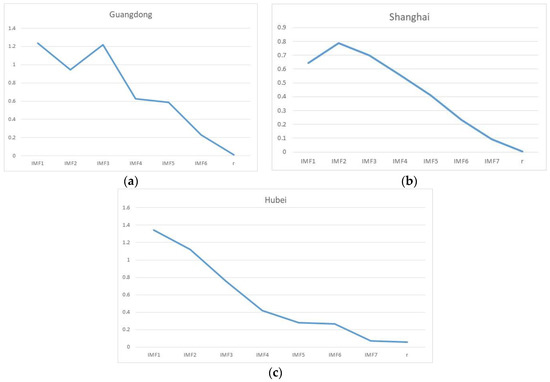 The SE values of each decomposed data sequence. (a) The SE values in Guangdong. (b) The SE values in Shanghai. (c) The SE values in Hubei.