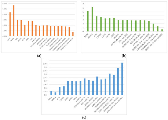 The MAPE, RMSE, and R2 values for the forecasted results in Shanghai’s carbon market. (a) MAPE (%). (b) RMSE. (c) R2.