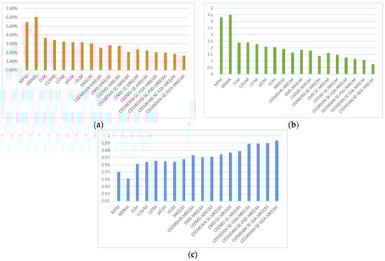 The MAPE, RMSE, and R2 values for the forecasted results in Hubei’s carbon market. (a) MAPE (%). (b) RMSE. (c) R2.