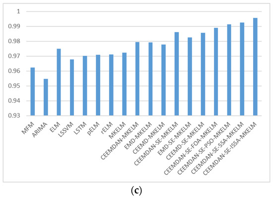 The MAPE, RMSE, and R2 values for the forecasted results in Guangdong’s carbon market. (a) MAPE (%). (b) RMSE. (c) R2.