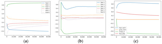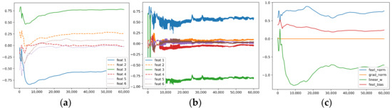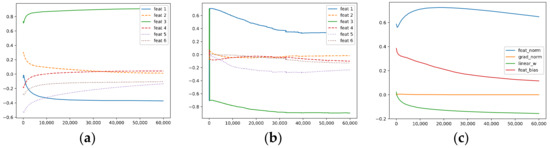 Two lines of previous work are related to our work. The first focuses on the feature learning process. Among them, the authors of [17] studied a two-layer ReLU network and proved that the feature learned by each neuron contains a non-robust dense mixture of the features, and these mixtures are one of the causes of adversarial examples. The authors suggested that adversarial training is actually a feature purification process. The authors of [18] designed a multi-view data model and proposed that, when the dataset has this multi-view structure, a network trained with cross-entropy loss via gradient descent (GD) quickly picks up a subset of features for each label such that the majority of the training examples are classified correctly; then, the model memorizes the remaining single-view data without learning other informative features. The authors of [19] studied how momentum improves generalization and proved that a model trained via GD initially only learns the large-margin data and then memorizes the remaining small-margin data. In contrast, a model trained via GD with momentum accumulates large historical gradients and, thus, can keep learning features and memorizing less noise. The authors of [20] considered a linear DNN and proposed that the learning dynamics is closely related to the singular value decomposition (SVD) of the input–output correlation matrix and that modes with stronger explanatory power, as quantified by the singular value, are learned more quickly. The authors of [21] studied the learning dynamics of a single-hidden-layer ReLU neural network and showed that input norm and the features’ frequency in the dataset lead to distinct convergence speeds, which might be related to the generalization performance of the model. They identified a phenomenon named gradient starvation, where the most frequent features in a dataset prevent the learning of other less frequent but equally informative features. The authors of [22] defined gradient starvation via the SVD of the neural tangent random feature (NTRF) matrix to characterize the phenomenon in which the model minimizes cross-entropy loss by capturing only a subset of features and fails to discover other predictive features. The authors also provided a theoretical explanation for this feature imbalance. The authors of [23,24,25,26] studied the simplicity bias in DNNs, i.e., the model can rely on the simplest features and remains invariant to other predictive complex features. The authors of [27] split the Jacobian spectrum into “information” and “nuisance” spaces associated with large and small singular values and showed that the generalization capability of the model is controlled by how well the label vector is aligned with the information space. Many studies have tried to improve the feature learning process from an optimization perspective. The authors of [28] proposed the AdaGrad optimization algorithm; they used historical information of gradients to enable the model to better learn those highly predictive but rare features that are hard to learn. The authors of [29] proved that natural gradient descent (NGD) [30] outperforms GD in the misaligned setting, whereas GD has an advantage when the signal is aligned. The authors showed that a preconditioned update that interpolates between GD and NGD can be performed to obtain an optimal empirical risk.