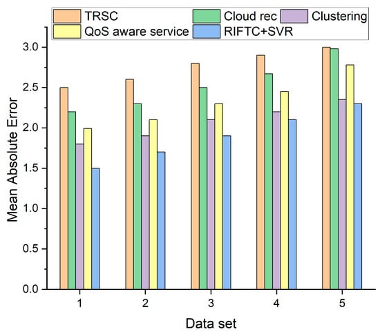 Comparative analysis of MAE of RIFTC+SVR with TRSC [30], Cloud rec [31], Clustering [18] and QoS aware service [32].