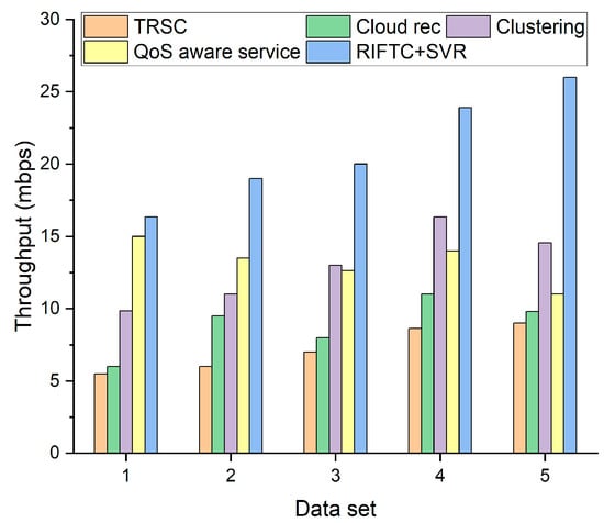 Comparative analysis of throughput of RIFTC+SVR with TRSC [30], Cloud rec [31], Clustering [18] and QoS aware service [32].