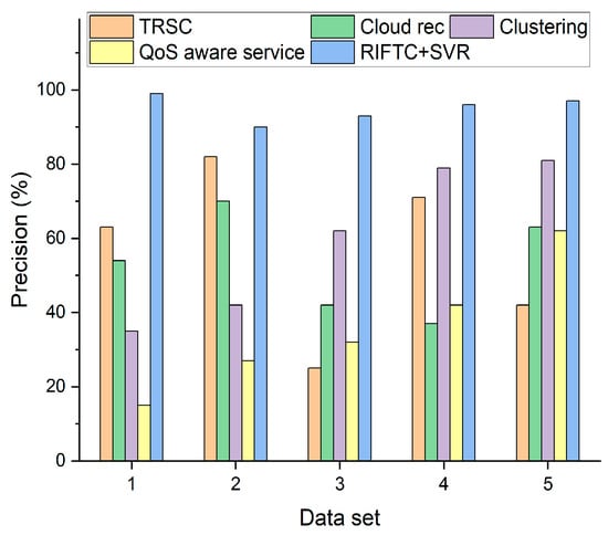 Comparative analysis of precision of RIFTC+SVR with TRSC [30], Cloud rec [31], Clustering [18] and QoS aware service [32].