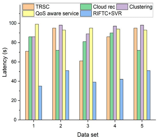 Latency, a term frequently used in networking slang to refer to the full round-trip time required for a data packet to transit, is the interval of time between a user action and a web application’s response to that action. The amount of time it takes for a resource to travel between the moments the browser requests it and the moments the browser receives it is one way to gauge latency. Milliseconds, or ms, are widely used to assess latency. The time it takes for a system to reply to queries or requests for data of various volumes and complexity can be used to compare latency with datasets. The findings can then be analyzed to discover any trends or patterns and develop a means to improve performance and reduce latency. This can help to guarantee that an information processing system is capable of handling the requirements of a business or application and giving users quick access to the data they require. Figure 5 demonstrates how the recommended strategy (RIFTC+SVR) resulted in a 51% latency. Clustering (72%), Cloud Rec (98%), TRSC (95%), and QoS aware selection (93%), taken together, are all lower, offering proof of the suggested system’s successful performance (Table 4).