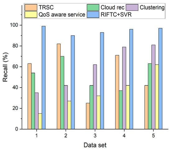 Recall is a performance indicator for binary classification models that quantifies the percentage of correctly detected positive cases. The recall estimation of a machine learning model may be impacted by the network payload, which is the volume of data carried over a network. To evaluate the model’s capacity to locate optimistic samples, we utilize the recall measure. The recall is computed by dividing the total number of favorable samples by the percentage of significant samples that were properly identified as positive. This ratio is then multiplied by 100. Figure 6 shows that the suggested approach (RIFTC+SVR) produced a 97% recall rate. When combined, Clustering (76%) is lower than Cloud Rec (68%), TRSC (89%), and QoS aware selection (73%). It provides evidence of the successful operation of the suggested system (Table 5, Figure 7).